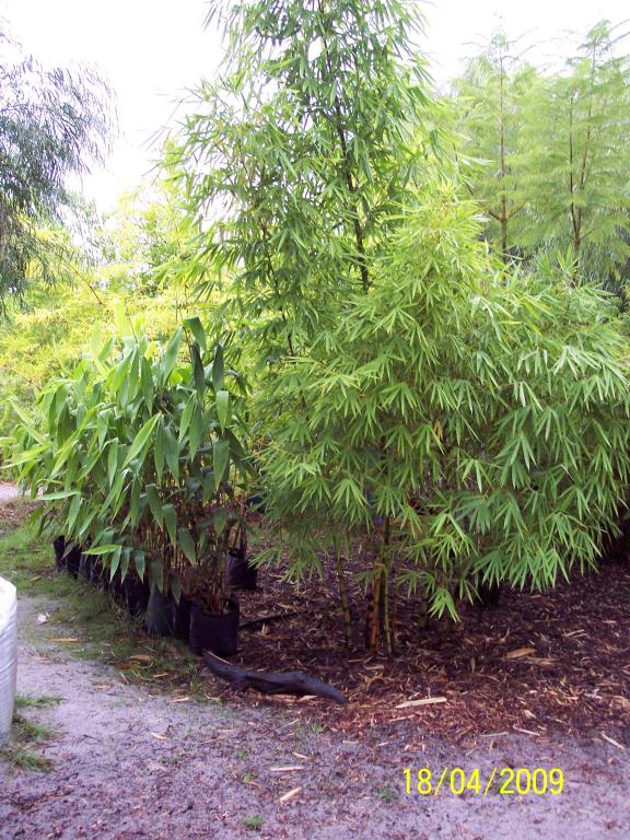 Previous Image Next Image Giant Buddhas Belly Bamboo or Wamin (Bambusa vulgaris ‘Wamin’), with Tiger Grass (Thysanolaena maxima) in bags on the left