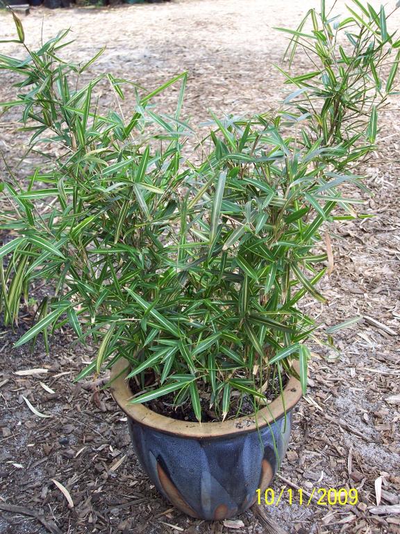 Tsuboi Bamboo (Pleioblastus shibuyanus ‘Tsuboi’) exhibits a subtle variegation in its foliage. It grows to 2m tall, in time